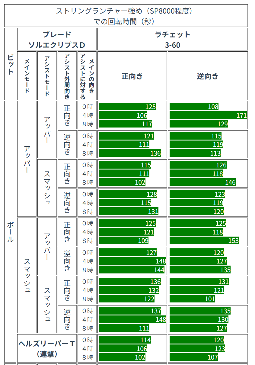 まぁ全体としてはボールで2分くらい、ニードルで1分半くらい。抜群では無いにしろまぁまぁ回ってる。 あと比較のヘルズリーパー、前の受け流しモードよりなんか落ちてるなぁ。ラチェットも同じわけだし、このくらいのモードチェンジでこんなに変わるとは思えないからこれは環境の影響かな? でもヘルズリーパー、CXとしてはそこそこ回るイメージだから、今回対等それ以上な感じで回ってるソルエクリプス、なかなかかもしれない。重量もあるしね。