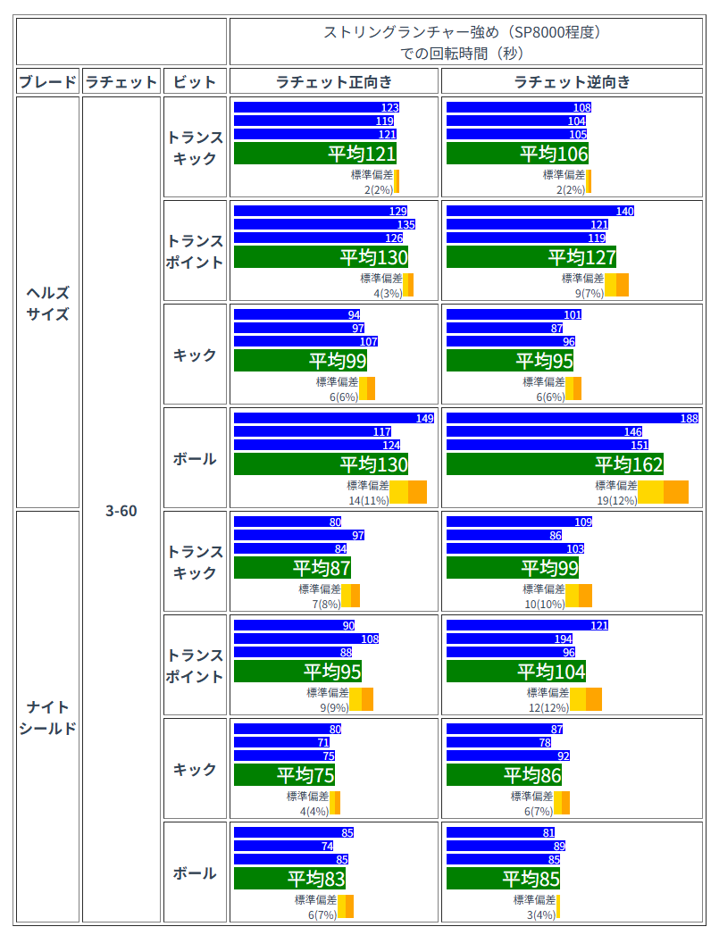 ストリングランチャー強め(SP8000程度) での回転時間(秒) | ||||||
